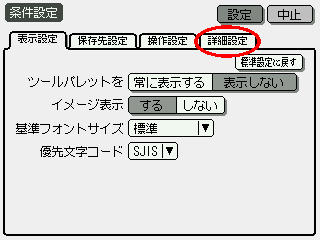 Wir finden vier Karteikarten, von denen die ganz rechte ("Shousai settei") die entscheidende ist.