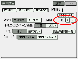 Mir ist nicht so ganz klar, wie der Sharp nun wirklich mit dem Internetcache umgeht. Reseviert er ihn, oder achtet er nur drauf, dass dieser Bereich nicht größer wird als der voreingestellte Wert? Keine Ahnung. Aber da ich mit meinem P10 mangels mobilem Modem nicht ins Internet gehe, wäre es mir am liebsten, der Cache hätte die Größe "0 kB". Und das stellen wir jetzt ein: